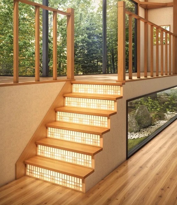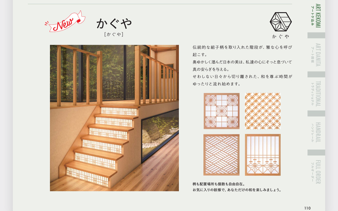 「かぐや」は伝統的な組子細工の技術を活かしたデザインで、障子のような柔らかい雰囲気を階段に取り入れることができます。