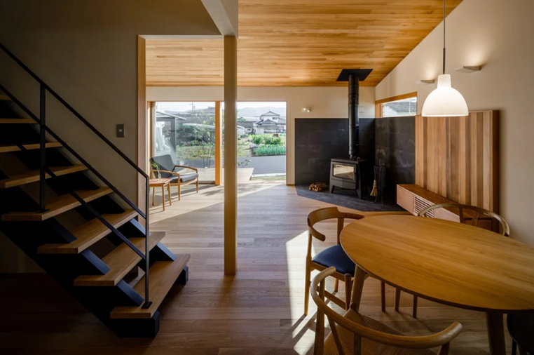 スケルトン階段は、吹き抜け空間に採用されることも多く、構造が見えることで空間に抜け感や軽やかさをもたらします。