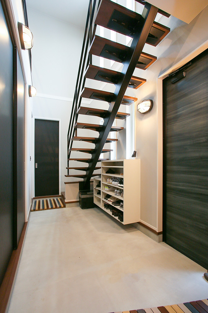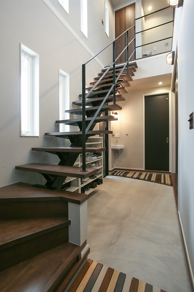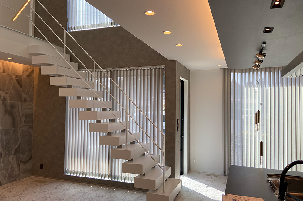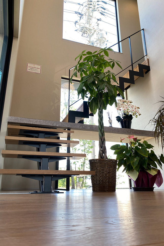 一般的には踏み板の下に垂直の蹴込み板がない「スケルトン階段(オープン階段、シースルー階段、ストリップ階段とも呼ばれます)」を希望されるお客様が鉄骨階段を採用するケースが多く、室内に光や風を通すデザイン性の高い階段が実現できます。